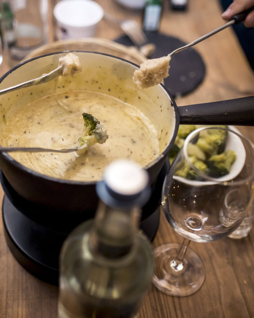 Hier wird eingetunkt, gelacht, geprostet und genossen: cremiger Käse, dampfende Kartoffeln, knackiges Brot, vielleicht ein Schlückchen Weißwein – und ganz viel Alpenflair.